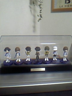 いえね、昨日のフィギュアを入れる為のフィギュアケースを探してたんですよ。(しかもコレ、だんなが「ケースがあった方がええんじゃない?」と言ってくれた^^どんだけオープンヲタになったんだ、わたしは・・・)でね、はじめ百均に行ったんですよね。そしたらサイズ的にいいのがなくって、そのショッピングセンターのヲタク系ショップ(フィギュアやラジコンやらカードやらが売ってあるお店)に、行って見ました。その間、だんなはコリをほぐす為にリラクゼーションショップに行ってたので、わたしと息子の2人で行きました。が、そのブースに入ると息子は一目散にムシキングのゲームに行ってしまい、わたしはおどおど店内を物色・・・。すると店員さんが、話しかけたそうにウロウロしてたんですよ。チラっと見るとそのあまりのアキバ系さに、わたしちょっと引き気味に(笑)そしたら、「何かお探しですか?」と声を掛けられまして。どうしようかと思ったけど、こんな面白そうな事はそうそうないかもと思い、「フィギュアケースを探してるんですけど・・・」と言ってみました。するとね、「こちらですねー・・・」から始まって、ベラベラと説明を始めてくれたんだけど、喋り方がおかしくておかしくて!!!!!(ひぃー)あまりに面白いので「このケースの中板は可動式ですか?」とか「これより小さいケースは?」とか質問してみたの!そしたらさー「これより小さいのは・・・とか言われても僕もこまっ、困るんですけど・・・っ、ま、ここにあるだけだと思ってくれれば、まち、間違いないと思いますっ」ってさー、すっげー早口で挙動不審に・・・でも笑顔で話してくれてさー(笑)イマイチ、こう文章にすると面白みが伝わらないんだけど、なんか貴重な体験をしましたvvんで、高かったら買わないつもりだったから「今日は見るだけのつもりなんです」って言ってたんだけど、ちょうど値段的にも大きさ的にもいいやつがあったから結局レジに持っていったらさー、「あっ、あっ、今日は、見るだけって言って・・・あっ・・・買われるんですねっ・・・あの、このサイズから集められて増えてきたら大きなケースでフルコンプとか・・・されたら・・・あはは」とかまたすげー早口なんだよ!(笑)でもね、「ま、お子さんが集められてるんでしょうけど・・・」って言われた(笑)すんませんが、わたしなんですけど^^でもよかったよ、ヲタクの人にヲタクって思われなくてvvで、買ったケースに早速フィギュアを入れてみました♪計ってないのにピッタリJ-miniが7体入ったよーっ^^↓こんな感じです!