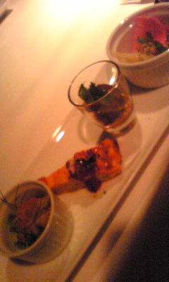 2軒目で、活ヒラメのカルパッチョ、ガーリックトースト、フォアグラのオレンジソース、ウニとほうれん草のクリームパスタ(写メ2枚目)・・・