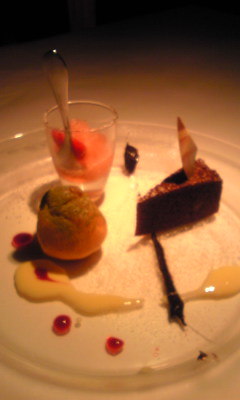 最初の店のコースで、前菜(写メ1枚目)、棒みたいなパン、マルゲリータのピザ、バジルの冷製パスタ、渡り蟹と九条ねぎのトマトパスタ、牛フィレ肉のステーキ、デザート盛り(写メ3枚目)、カフェ・・・