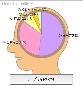 ざんぷの仁王がめらめら強そうなのでジェラシーです。だって立海大の3強の次に強いのは赤也だってずっと思ってた・・・つーか今でも信じてるんだけど、ちょ、仁王くんすげーんだもん・・・。真田もビックリ、みたいな?でも仁王パパにはいつもお世話になってるので、素直に応援してます^^ ひとつ言いたいのは、手塚の姿じゃなくて仁王の姿で戦って欲しいっすよねー。だって今の仁王、めちゃカッコイイんだものv